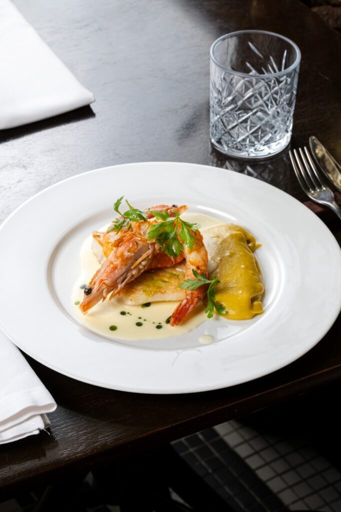 A abertura do jantar é com um couvert de pães e patês da casa, seguido de um percurso de quatro etapas. A primeira entrada traz Crudo de Atum Fresco com Stracciatella e Ovas; a segunda apresenta Vieira Grelhada com Creme de Couve-Flor Tostado, Ervilha Fresca e Parma.