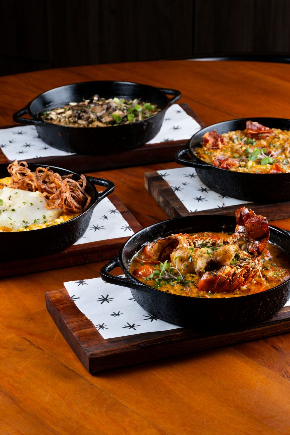 O Arroz de Cogumelos Trufados exibe cremosidade e texturas, arrematado com azeite trufado e amêndoas e preparado com um mix de cogumelos salteados. Por fim, há o Arroz Meloso de Bacalhau, com pimentões, azeitonas azapa, páprica defumada, parmesão e finalização de crispy de cebola.