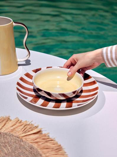 A colaboração também ganha vida na Casa Riachuelo, com uma curadoria de peças que traduzem o espírito de ambas as marcas. Entre os destaques, estão pratos, travessas, bowls e jarras com estampas da família Cereja, Sol e Zebra com alguns pintados à mão, reforçando o caráter autoral e artesanal da collab. A linha ainda apresenta vasos de cerâmica, adornos, cestos em fibra natural e toalhas estampadas, que levam o lifestyle solar da Triya para a decoração.